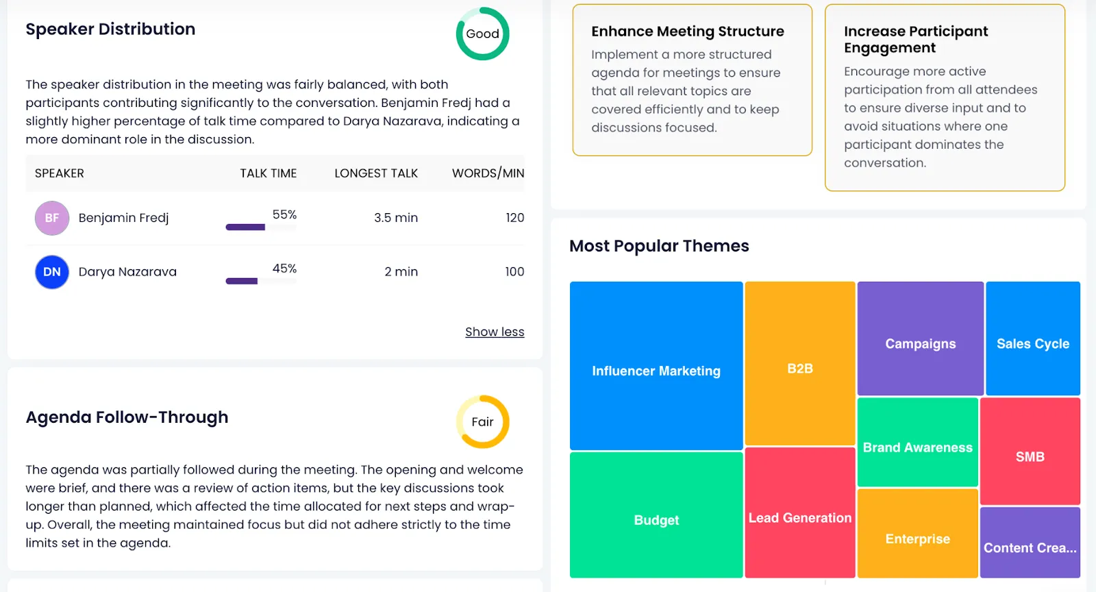 - Insights contextuais: O MeetGeek não apenas registra suas reuniões, mas também fornece informações valiosas ao rastrear tendências e engajamento dos palestrantes. Isso ajuda você a melhorar o desempenho da equipe, oferece oportunidades de treinamento e aumenta a produtividade.