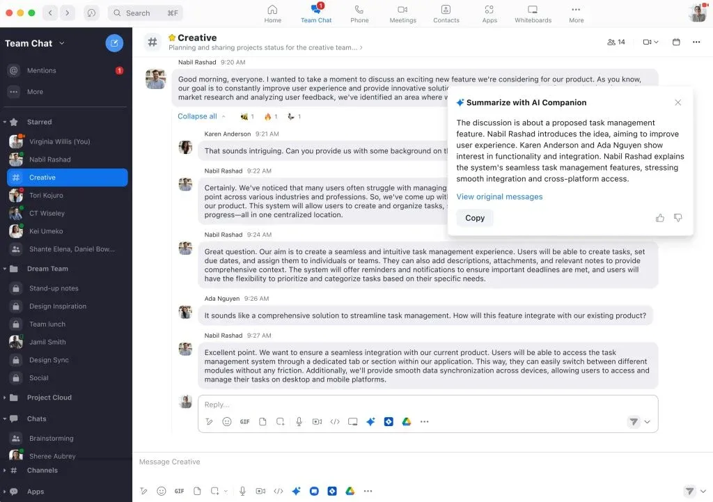- Chat da equipe do Zoom: O AI Companion do Zoom pode criar mensagens de bate-papo personalizadas em qualquer tom e duração desejados. Além disso, você pode pedir que ele resuma as conversas anteriores para que você possa se atualizar sem percorrer todas as mensagens.